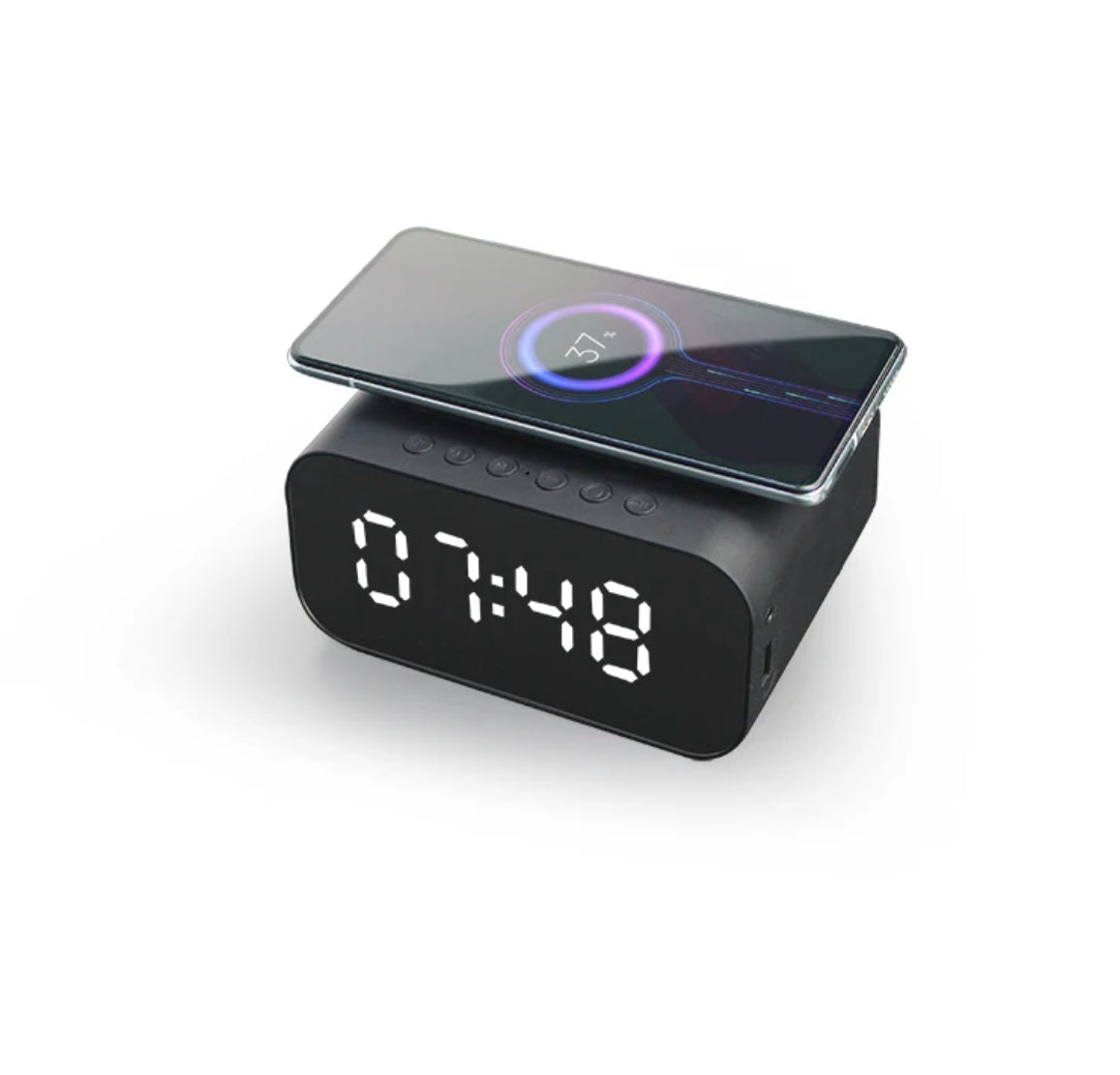 reloj con altavoz BT multifuncional: incluye funciones de reloj digital, despertador, altavoz BT, reproductor de música, radio FM y cargador inalámbrico, todo en un solo dispositivo.